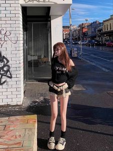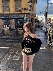 辣妹露肩长袖卫衣女秋季新款美式复古设计感小众慵懒别致斜肩上衣