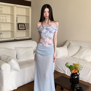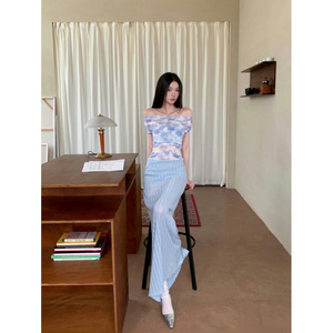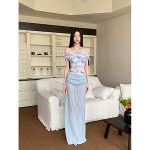秋新款蓝色网纱拼接度假长裙一字领修身气质连衣裙