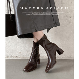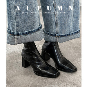 羊皮版~韩版高跟方头瘦瘦靴短靴女粗跟复古马丁靴英伦风短筒单靴