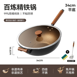 34cm平底玄武炒锅+钢化盖+送花梨木锅铲+海绵擦