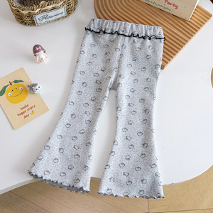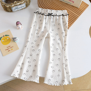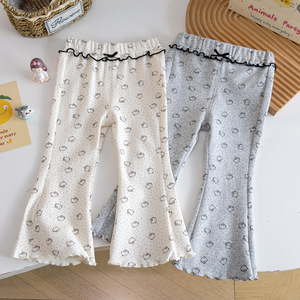 女童秋季卡通kt猫图案碎花喇叭裤2025新款洋气精致花边装饰休闲裤