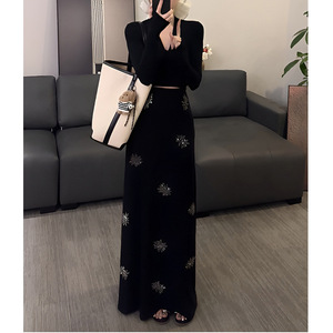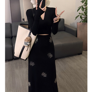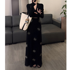 锦倩2025秋韩系紧身V领长袖打底上衣+高腰印花百搭半裙时尚两件套