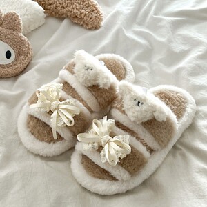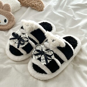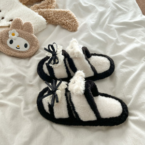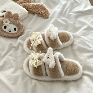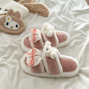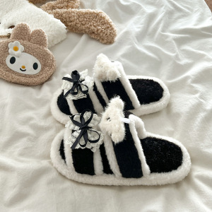 拼色蕾丝蝴蝶结毛毛拖鞋女外穿2025秋冬季新款百搭防滑一字棉拖鞋