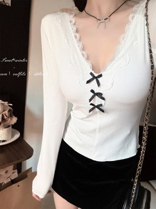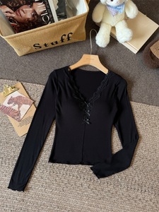 纯欲蕾丝深V领打底衫女秋冬2025新款修身甜辣内搭设计感长袖上衣