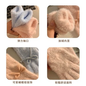 韩系可爱蓝色蝴蝶结毛绒针织手套女秋冬季加绒保暖防寒分指毛茸茸