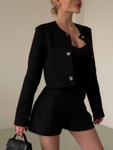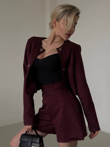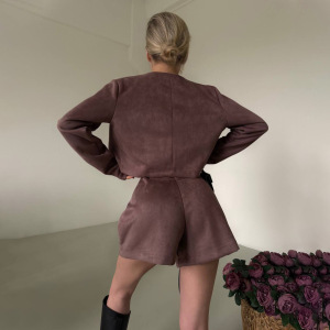 跨境复古仿麂皮套装女短款圆领外套高腰 A 字短裤轻熟辣妹两件套