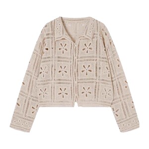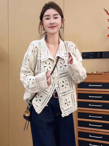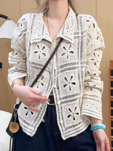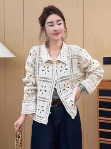 温柔风镂空钩花翻领长袖蕾丝衫外套女2025春秋新百搭时尚开衫上衣