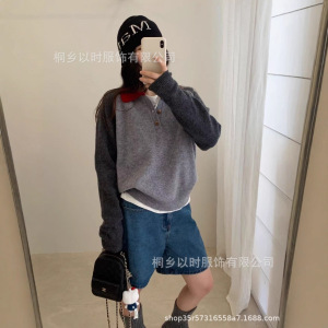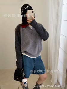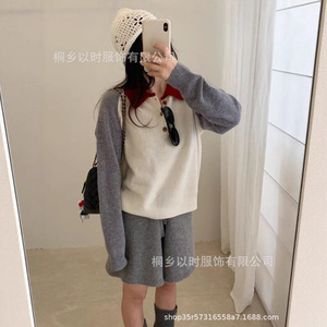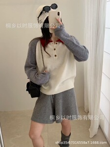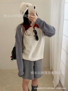 以时 羊毛撞色Polo领长袖针织衫女 2025秋冬新款韩系简约毛衣女