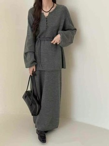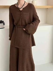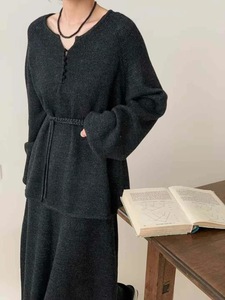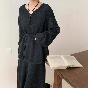 时尚休闲针织套装女2025秋冬新款收腰系带圆领上衣+半身裙两件套