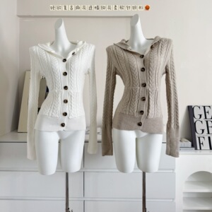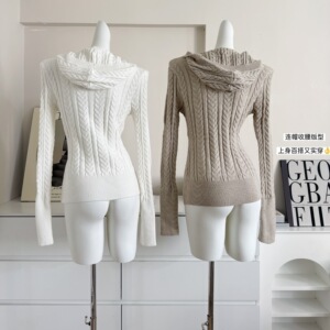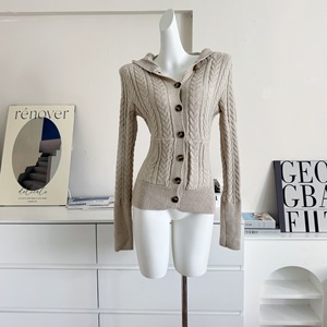 纯欲复古麻花针织纽扣修身显瘦长袖连帽开衫外套2025秋季新款
