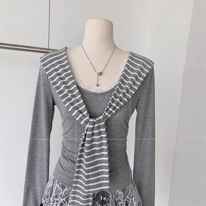 辣妹修身条纹坎肩蕾丝长袖t恤长袖2025秋季新款百褶半裙套装