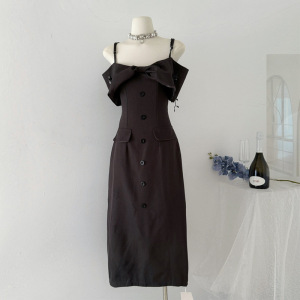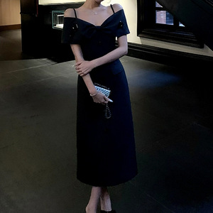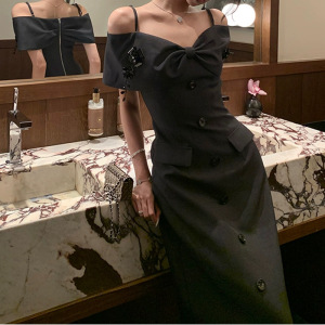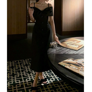 ZHOYUE 千金miu系吊带连衣裙夏季一字肩高知穿搭西装掐腰长裙高腰