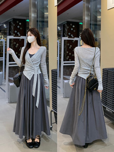 大码氛围感韩系设计绑带长袖T恤外穿开衫➕吊带连衣裙两件套