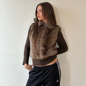 三湖连江Q25TP270欧美外贸新款秋冬气质拼接翻领拉链保暖毛毛外套