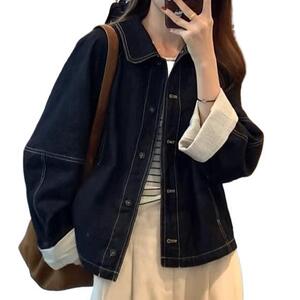 设计感条纹拼接袖口普洗蓝牛仔外套女2025春秋宽松小个子韩版上衣