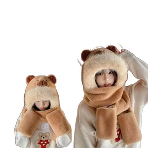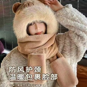 可爱卡皮巴拉帽子围巾一体三件套女秋冬毛绒护耳帽水豚保暖防风帽