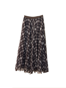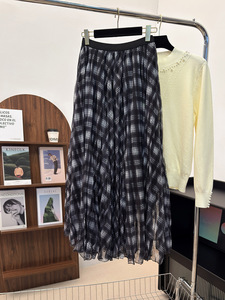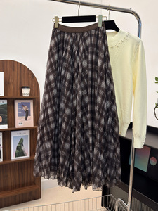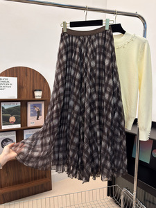 复古格纹网纱半裙2025秋季新款松紧腰褶皱飘逸不规则大摆伞裙9691