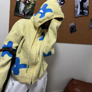 现货博主同款博主韩国小众潮牌提花连帽针织开衫毛衣外套