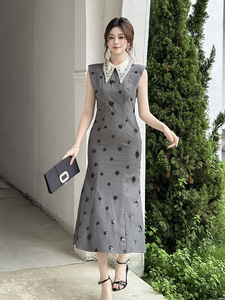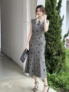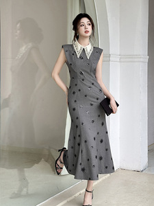 2025夏季新款女复古气质娃娃领减龄收腰包臀亮片鱼尾连衣裙51478