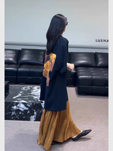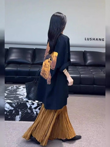 黑色印花上衣+金色半身裙