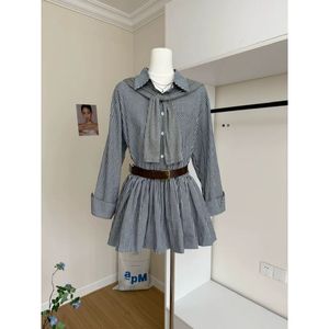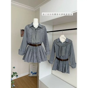 韩版时尚百搭中长款配腰带格子衬衫连帽披肩两件套