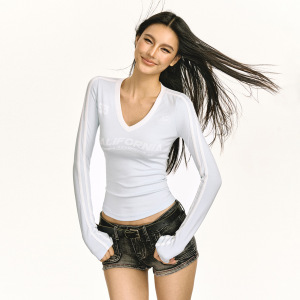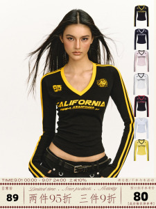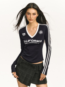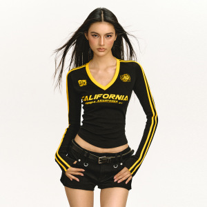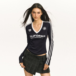 Ariseism美式复古辣妹球衣撞色V领长袖t恤女2025秋季新款修身上衣
