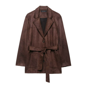 跨境欧美风女秋季装新款时尚商务高级感配腰带反绒皮效果夹克外套