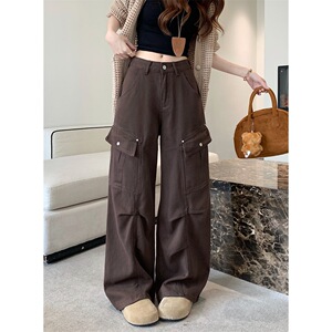 实拍~美式复古咖啡色工装牛仔裤女修身百搭宽松阔腿拖地长裤88436