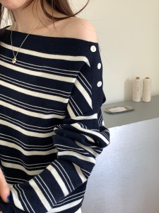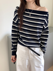 韩系设计感一字肩条纹毛衣女秋季2025新款慵懒宽松露肩针织上衣