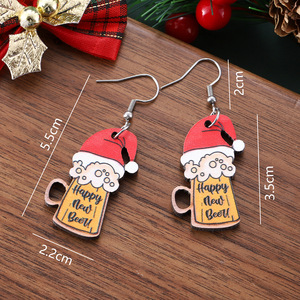 跨境新款新年啤酒杯吊坠耳环木质双面耳饰圣诞节新年节日派对礼物