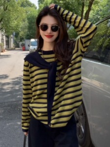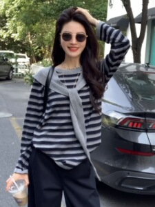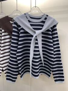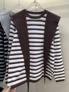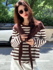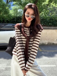 披肩连帽条纹长袖针织衫两件套女秋季2025新款休闲慵懒风宽松上衣