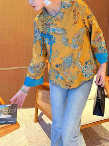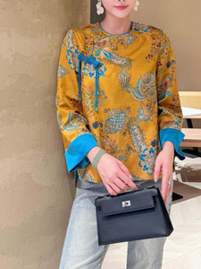 2025早秋新款新中式斜襟提花手工盘扣长袖复古真丝交织拼色小衫29
