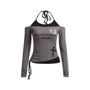 美式辣妹露肩假两件挂脖长袖t恤女秋季休闲酷辣抽绳一字肩上衣潮