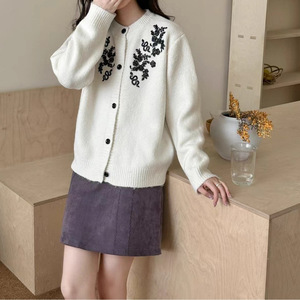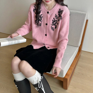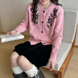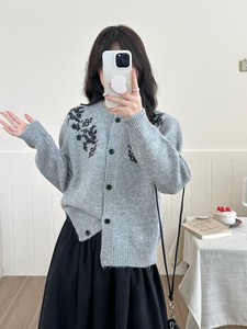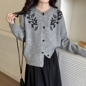 2025秋冬新款气质慵懒圆领刺绣毛衣宽松洋气减龄针织开衫外套女装