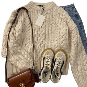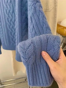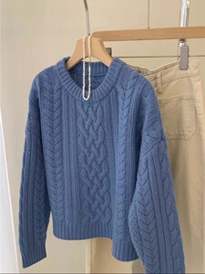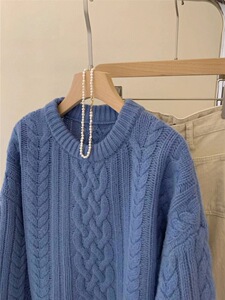 韩系蓝色浣熊绒麻花套头毛衣女秋冬加厚设计感小众慵懒针织衫上衣