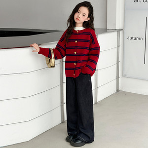 女童毛衣开衫秋装2025年新款条纹针织外套中大童洋气线衣裤子套装