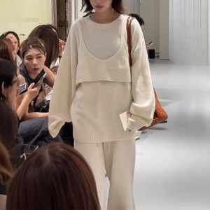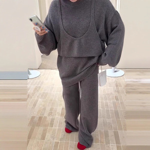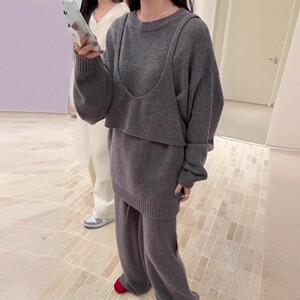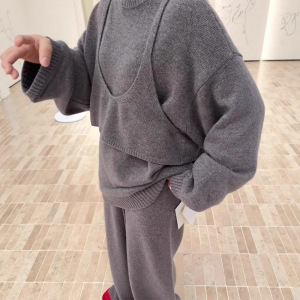 设计感灰色圆领毛衣女秋冬韩系穿搭宽松慵懒风针织吊带上衣套装