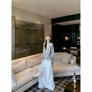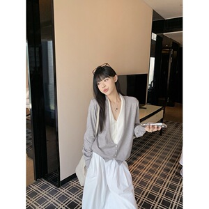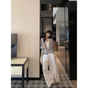 秋季宽松休闲撞色假两件上衣灰拼色针织衫+白色大摆阔腿裤套装女