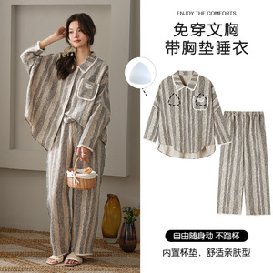 栗茵春秋季带bra泡泡绵女士长袖长裤睡衣可外出小众家居服套装