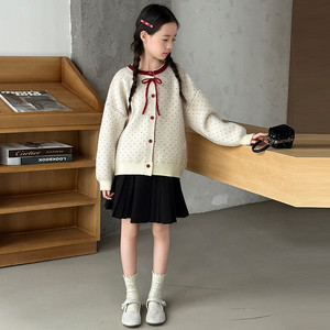 女童秋装毛衣开衫2025新款中大童公主风波点撞色针织外套外穿上衣