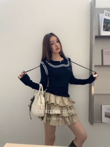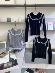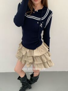 CXI 学院风针织连帽衫女秋季新款修身叠穿假两件上衣美拉德撞色衫