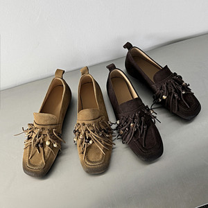 牛翻皮流苏单鞋女串珠单鞋秋新款真皮平跟鞋擦色做旧方头低帮单鞋