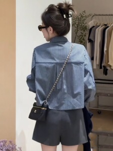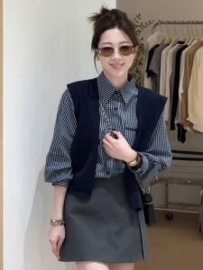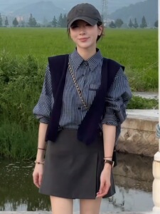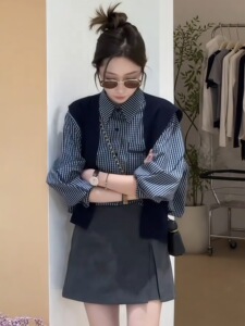 韩系时尚格子长袖衬衫两件套女2025早秋新款宽松休闲百搭披肩套装