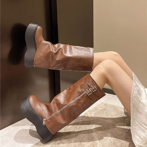 欧美风一脚蹬增高厚底长筒靴女2025秋冬新款不过膝长靴高筒骑士靴