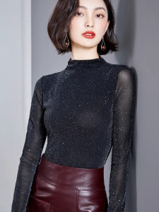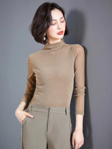 秋款欧货时尚洋气网纱打底衫女长袖薄款纱衣亮丝小衫修身显瘦上衣