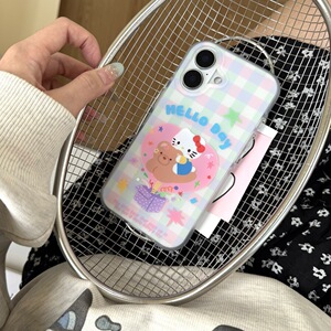 适用16ProMax田园小清新格子kt猫15Pro活力少女粉蓝色13/14/15款