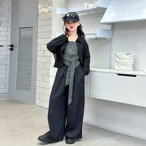 女童小香风套装2025春秋款设计感格纹吊带短外套休闲阔腿裤三件套