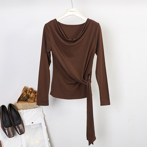 菲媛小众设计感系带收腰条纹上衣女 早秋新款荡领修身显瘦长袖T恤