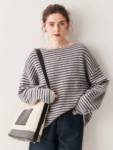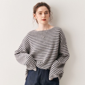 欧美条纹慵懒风软糯山羊绒衫女25秋冬一字领宽松落肩廓版显瘦毛衣