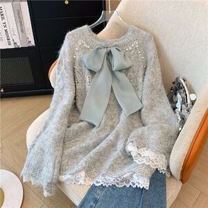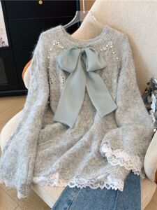 慵懒风钉珠蝴蝶结蕾丝拼接V领毛衣秋冬大码女装胖mm加厚针织上衣